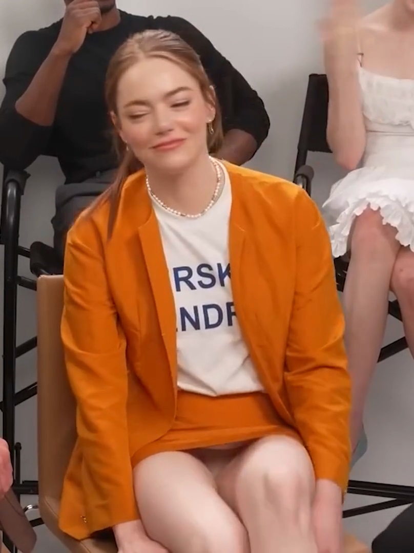 Emma Stone in a short skirt for an interview and everyone will decide for themselves whether she has panties or not